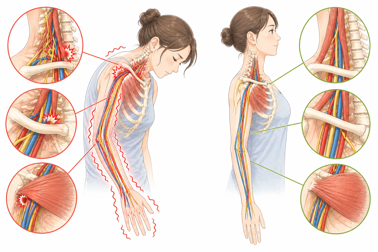特に、同じ姿勢が続いたあとや、つり革やドライヤーなど腕を上げ続けたとき、重たいバッグを持って腕を下げ続けたときに症状が悪化しやすいのが特徴です。「しびれが強くなってきた」「手に力が入りにくい・物を落としやすくなった」といった症状がある方は、早めに医療機関へ受診することをおすすめします。