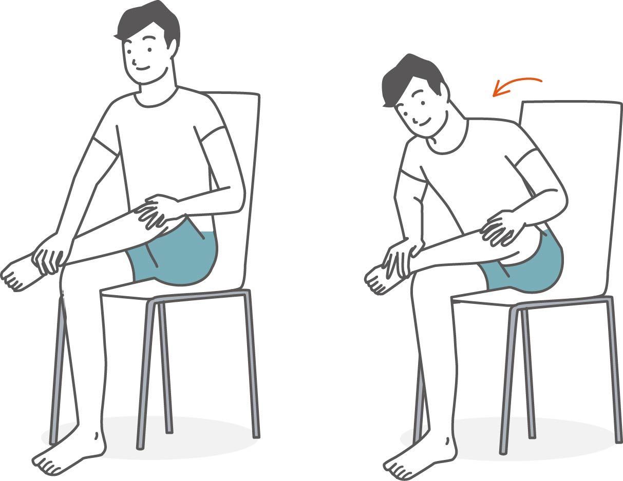 膝の上に反対側の足首を乗せ、息を吐きながら上体を曲げます。足を曲げている側のお尻まわりの筋肉がストレッチされることで、坐骨神経の圧迫が減り、症状の軽減が期待できます。