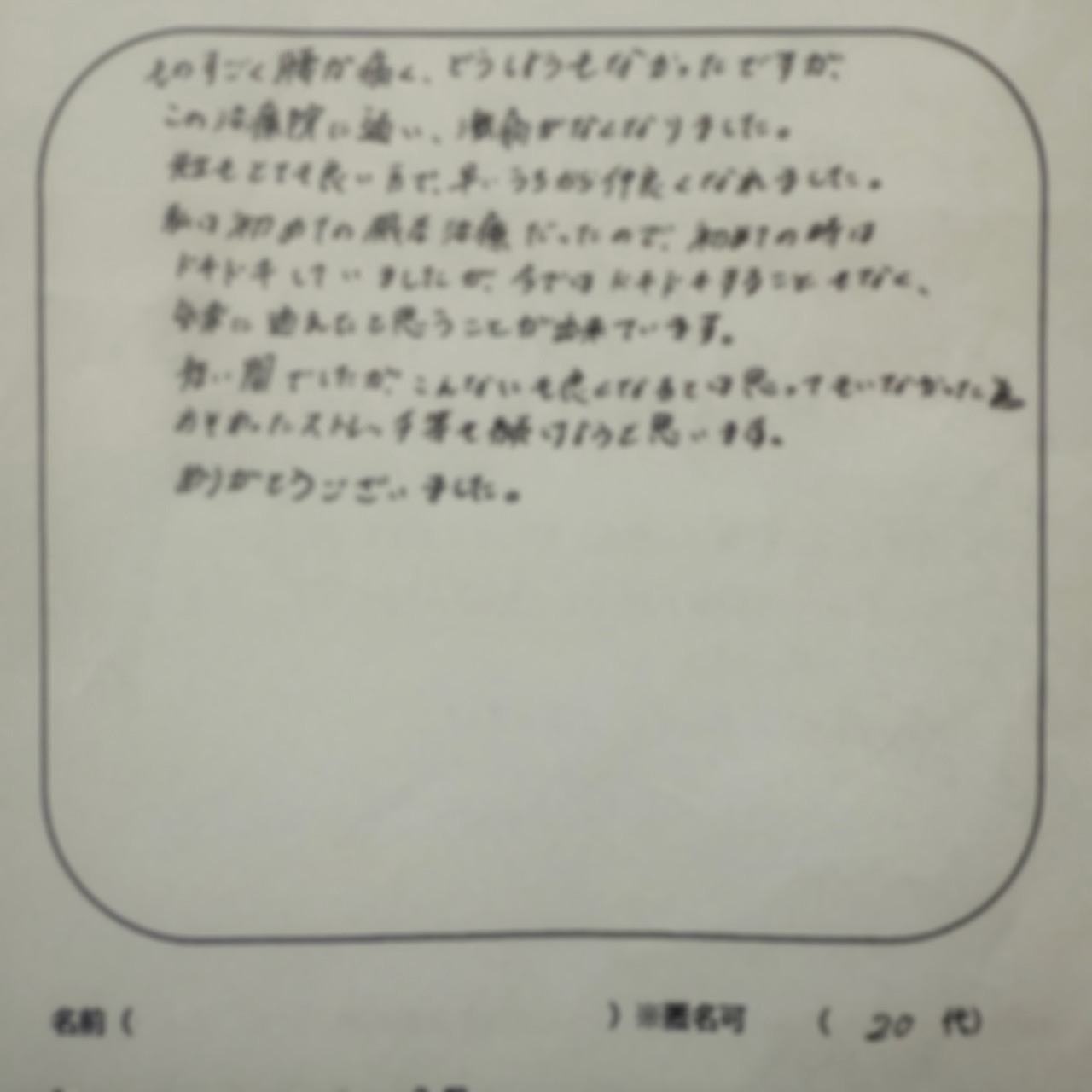 計画通り通院していただき日々の体のストレッチも丁寧に取り組んでいただいたおかげで、腰痛や太もものツッパリ感の改善はもちろん、全身の状態までもきちんとリセットすることができました。これからも応援しています。ありがとうございました。